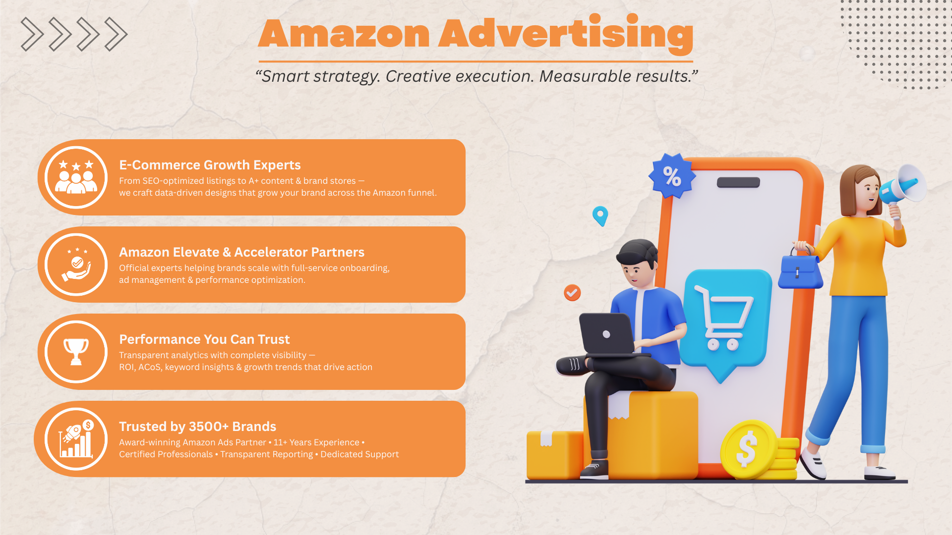 With 10+ years of experience and 3000+ satisfied clients, weโve helped brands of every size grow faster, sell smarter, and dominate the digital marketplace.